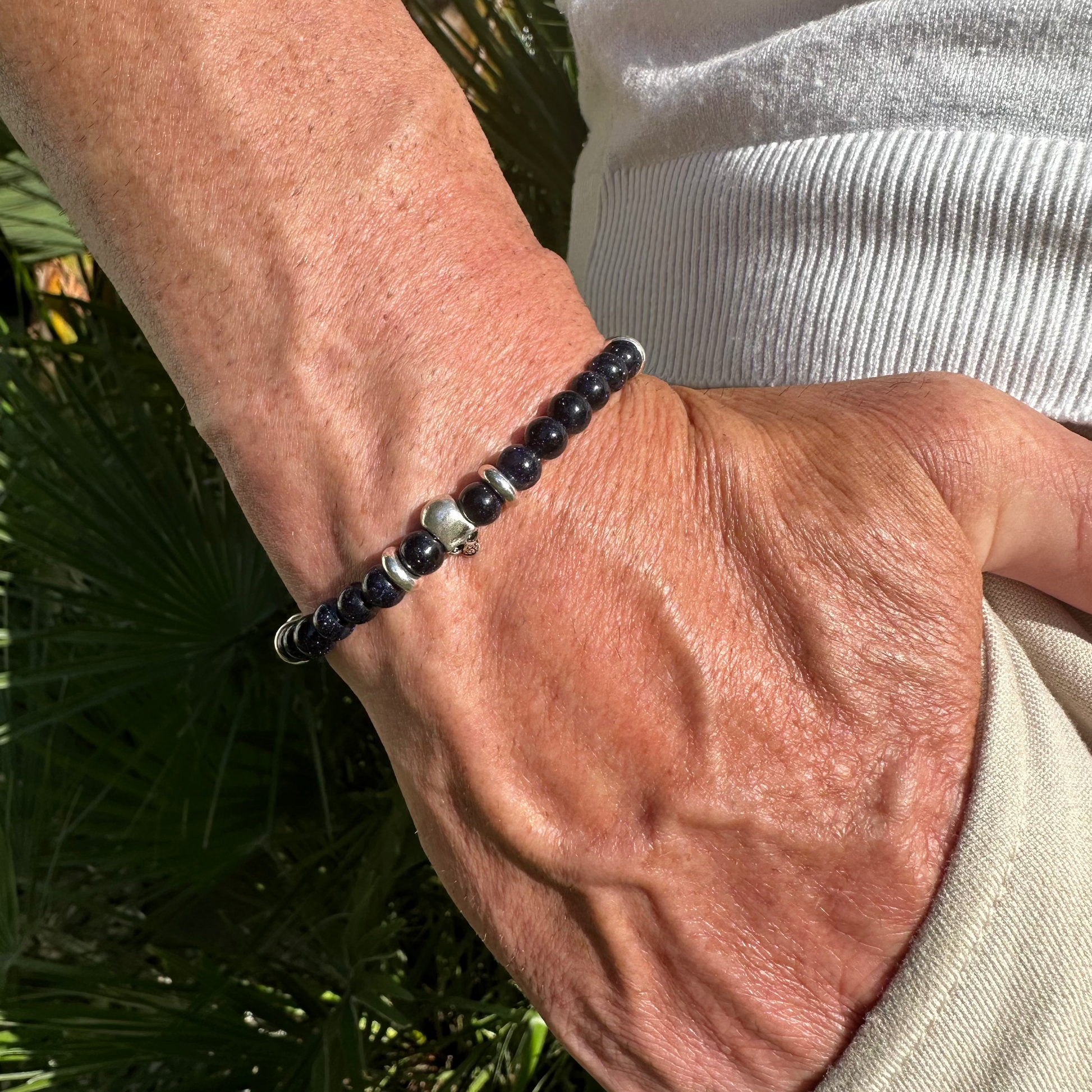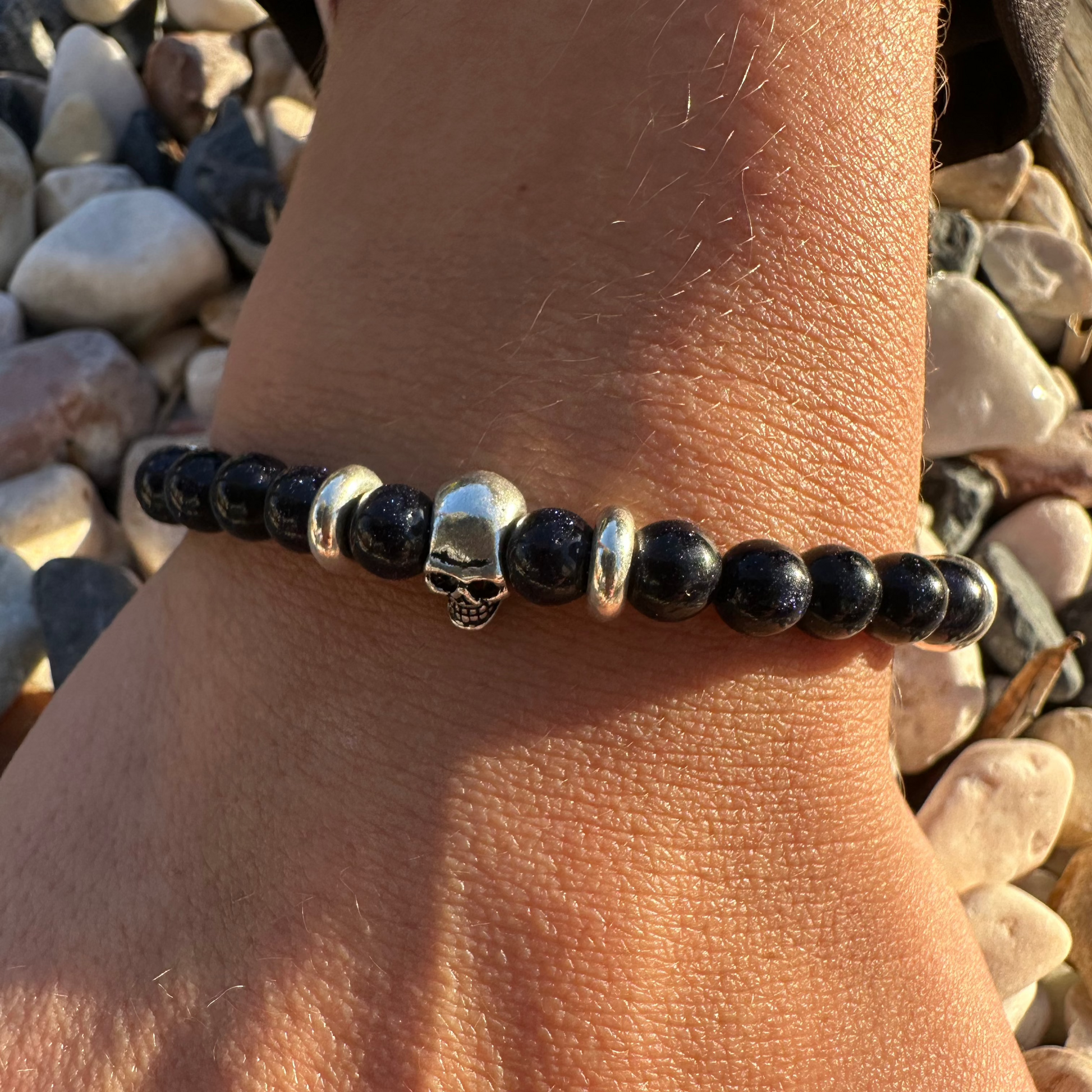 Eternity Noctis blends deep blue aventurine and sterling silver in a design that radiates calm strength and magnetic allure. The silver skull, centered among eight donuts and a Tibetan tube, mirrors the quiet energy of the night - still, timeless, and unshakably true.