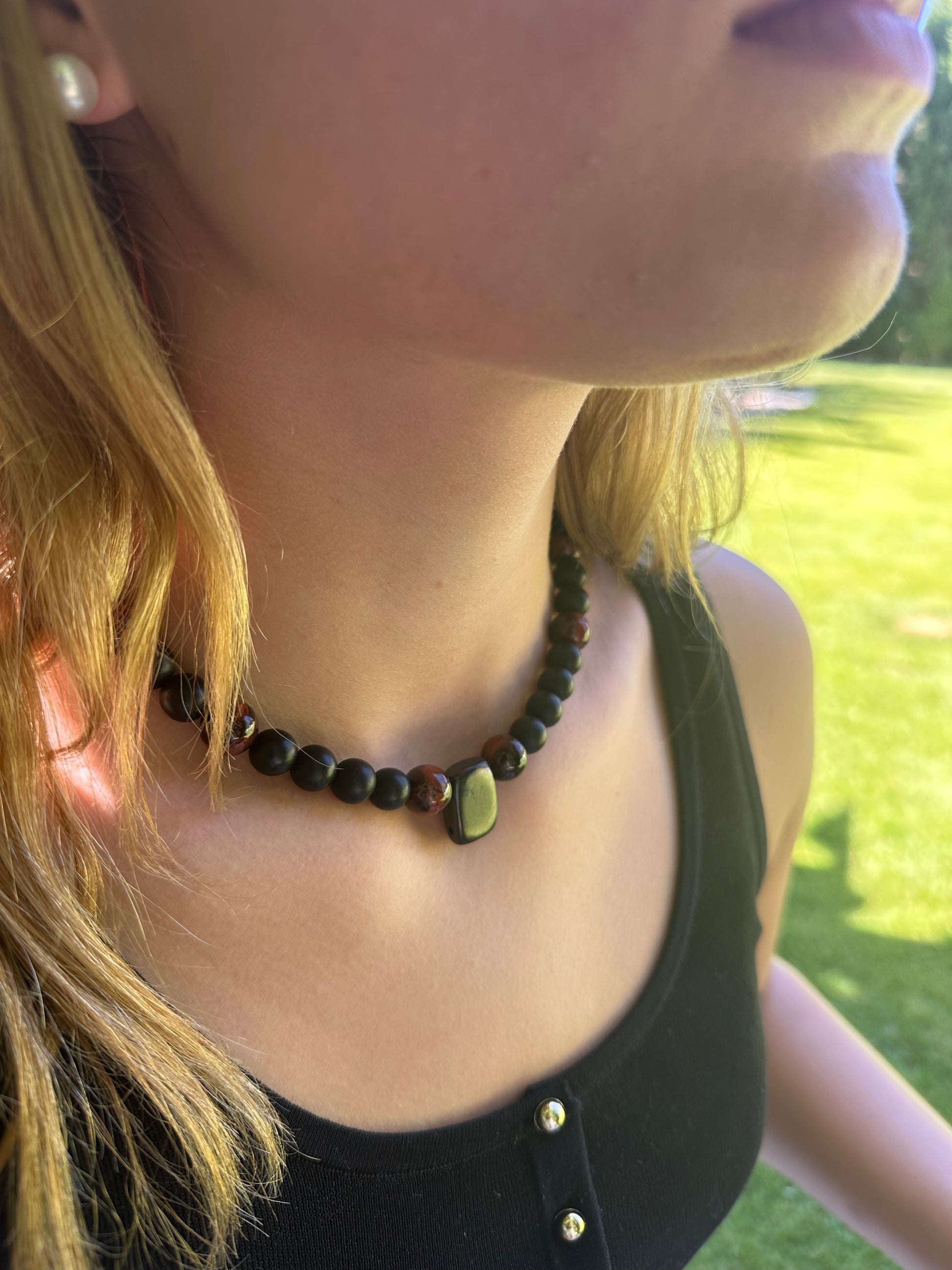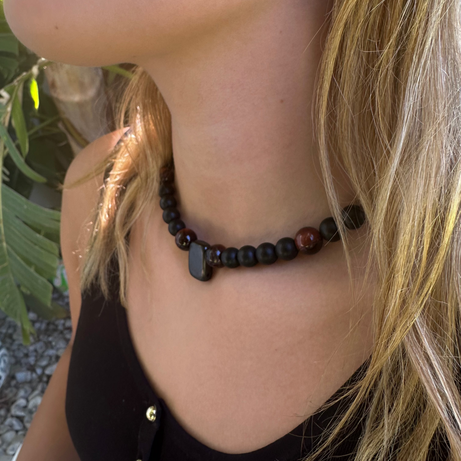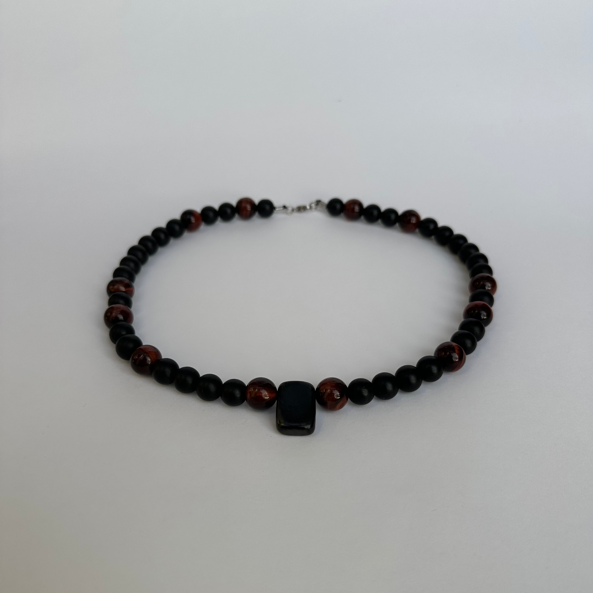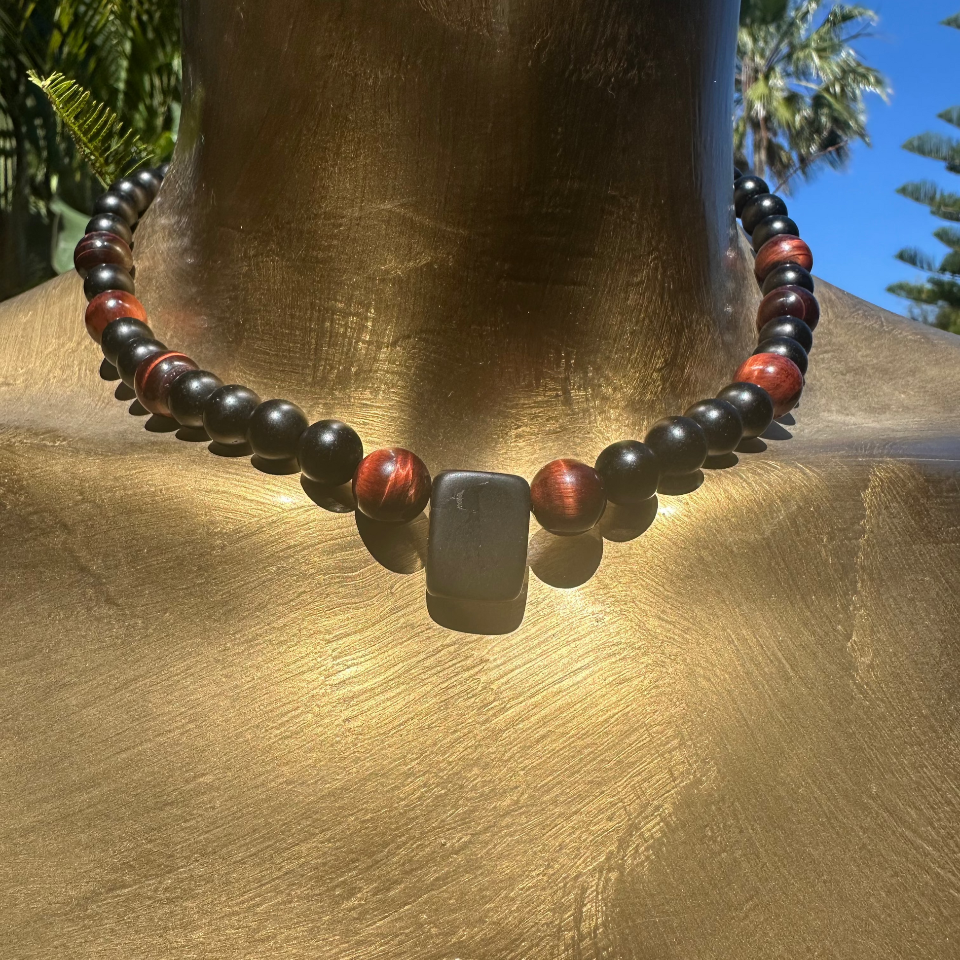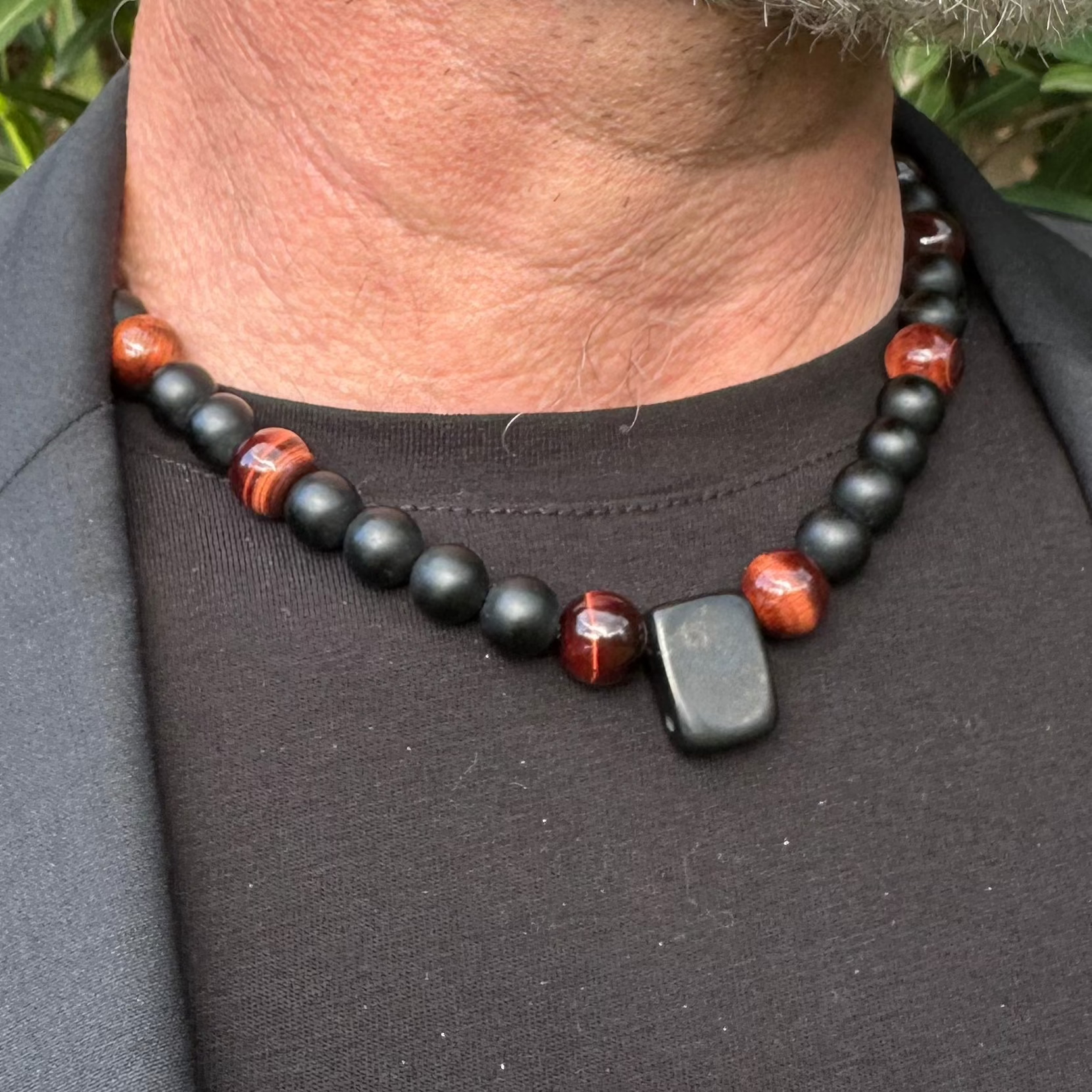 This 50 cm necklace blends the grounding energy of certified Shungite with the vibrant fire of Red Tiger's Eye, anchored by a bold rectangular Shungite centrepiece.