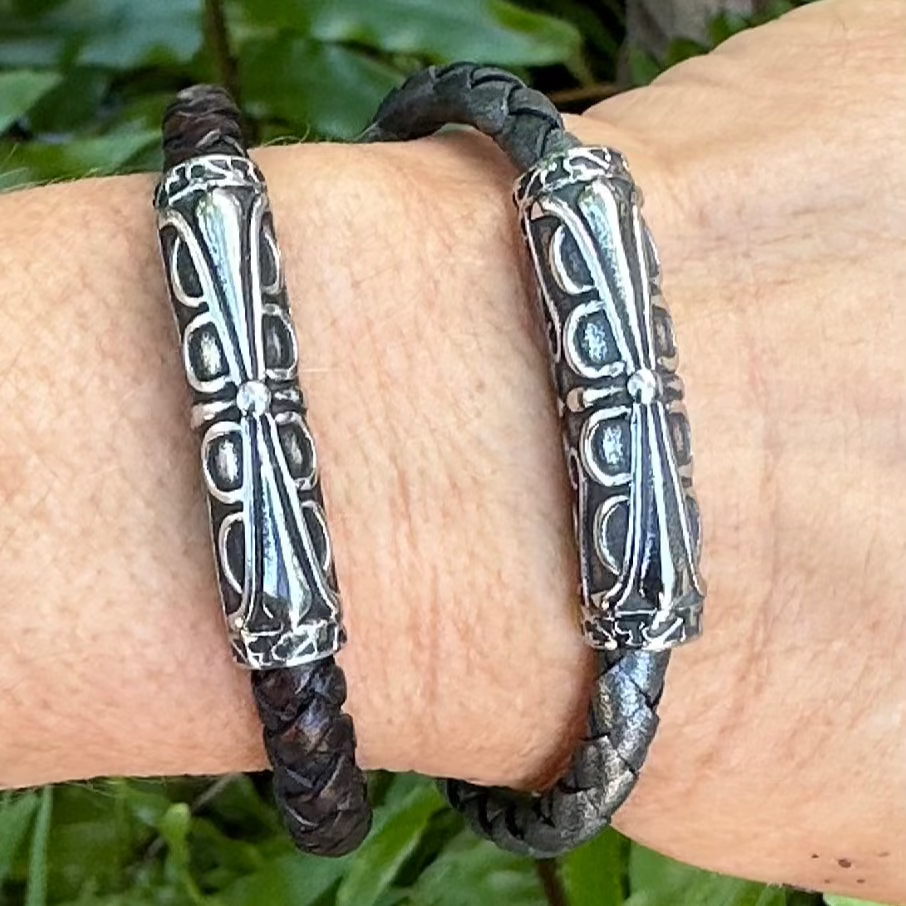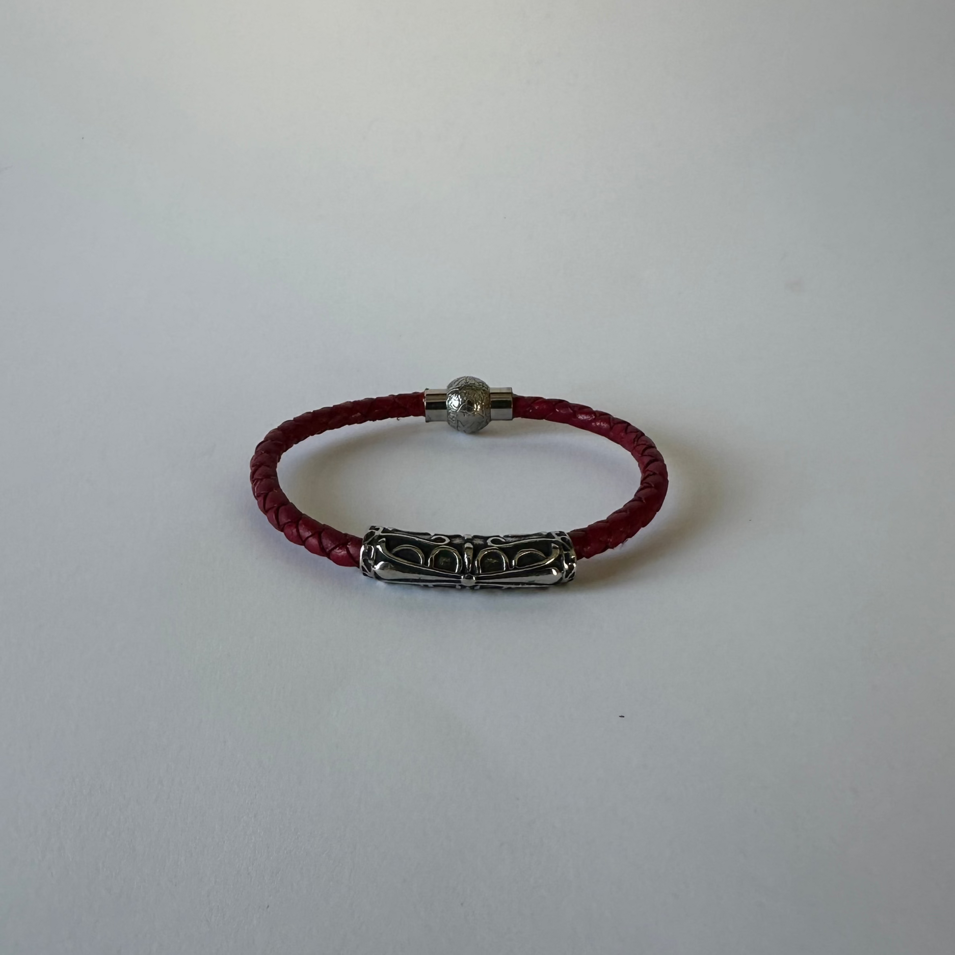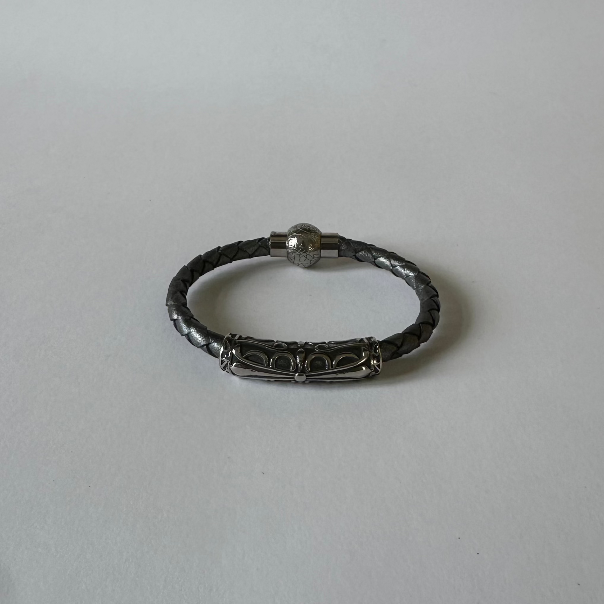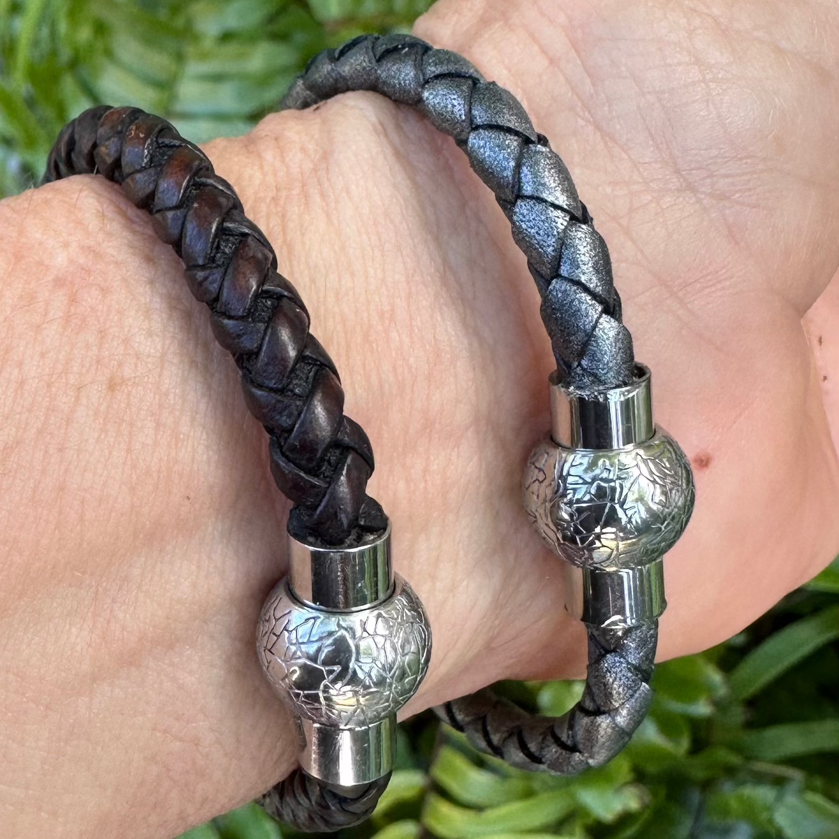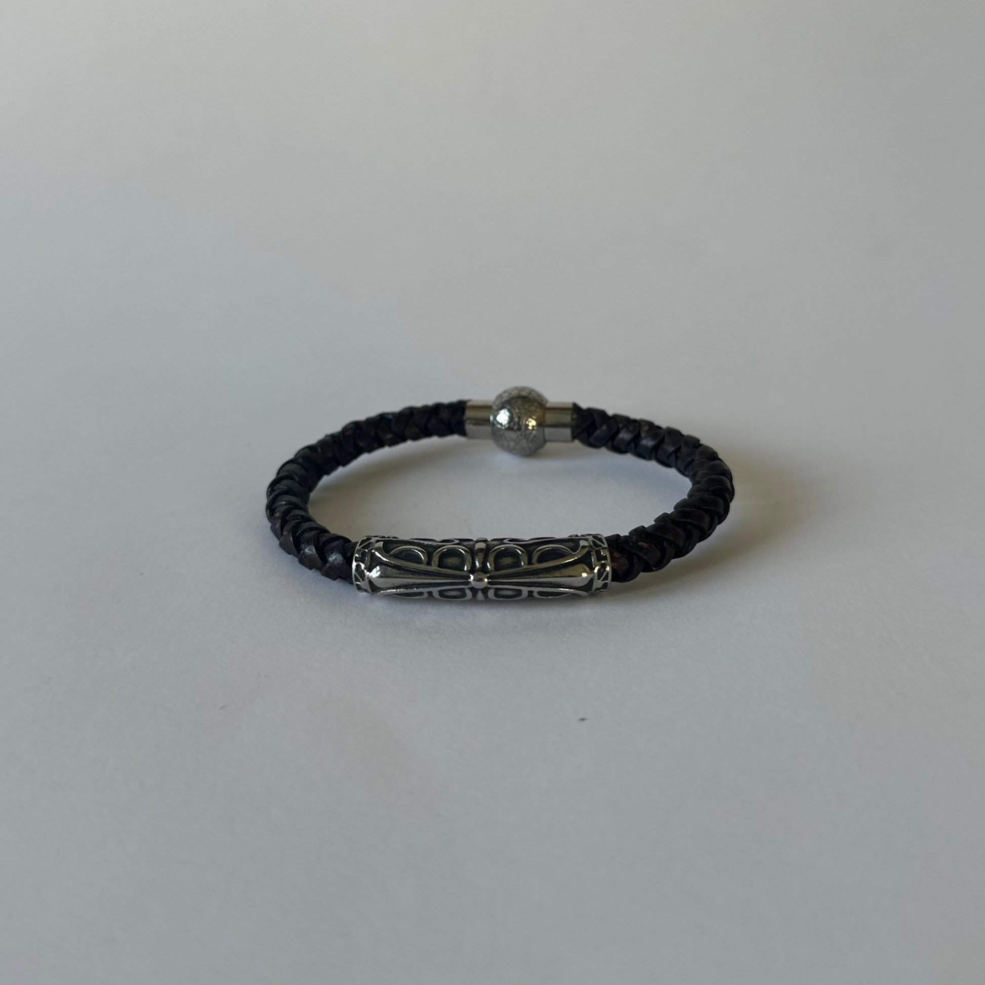 Introducing Loyalty Bracelet—a bracelet that symbolises strength, trust, and steadfastness in every relationship and commitment. Crafted with a braided round leather cord that blends natural tones, it's both rugged and elegant. The magnetic clasp, shaped like a globe, embodies the boundless and enduring nature of loyalty. A fleur-de-lis charm stands as the centrepiece, representing the timeless commitment to honour and integrity.
