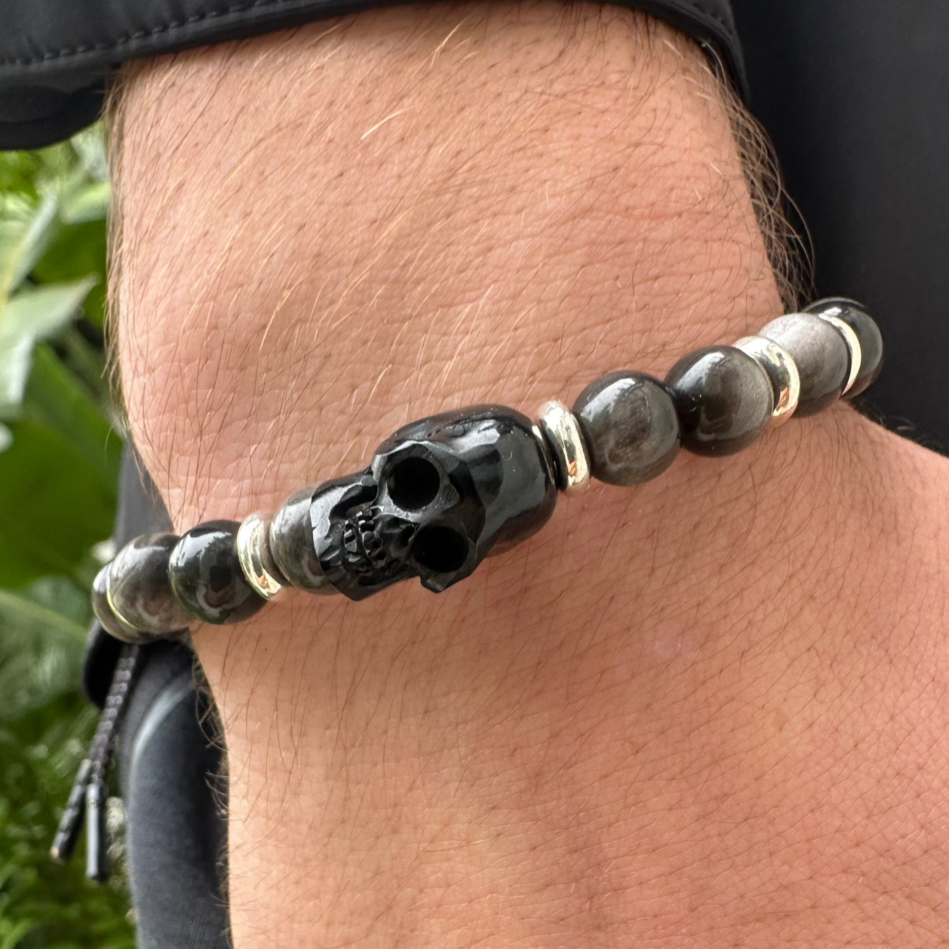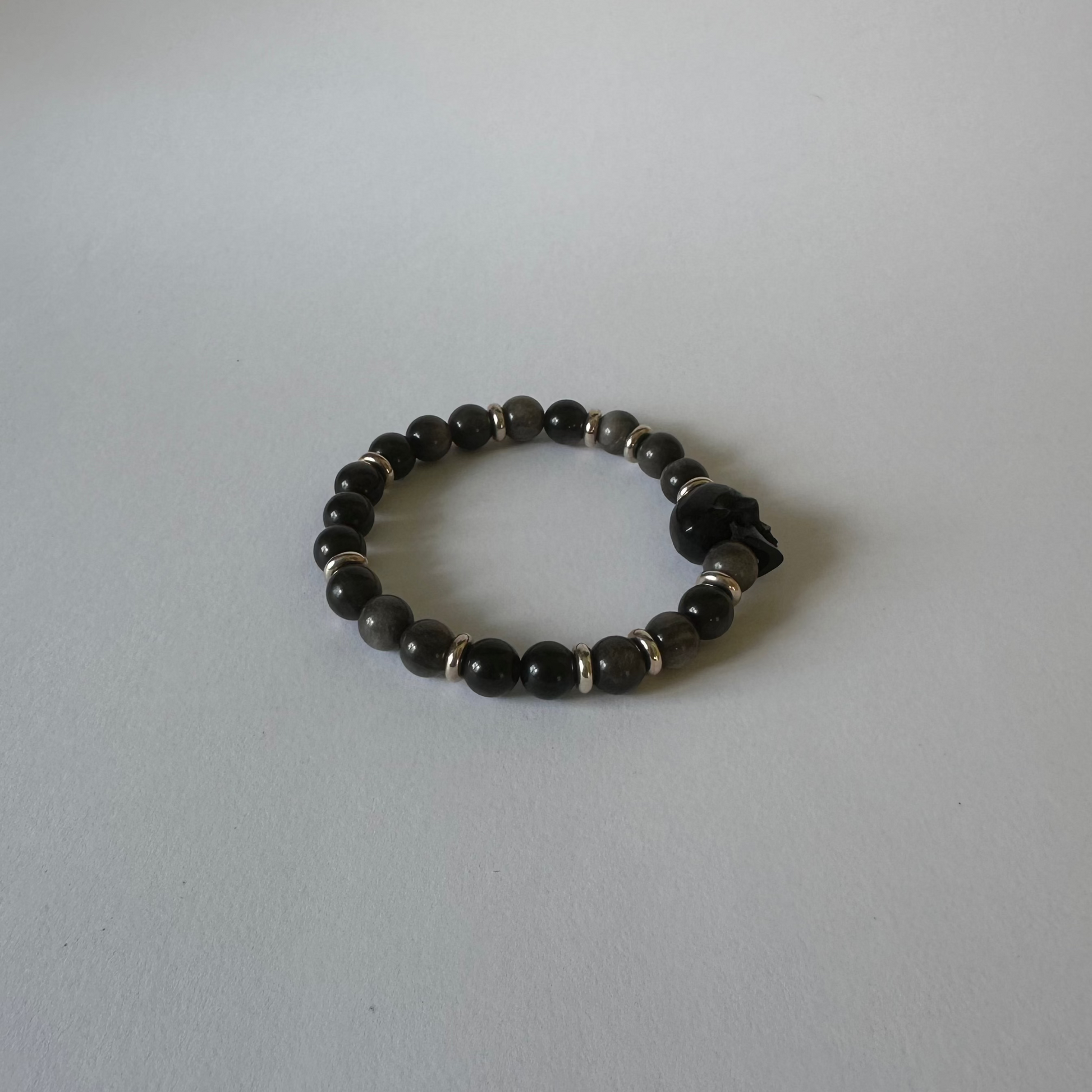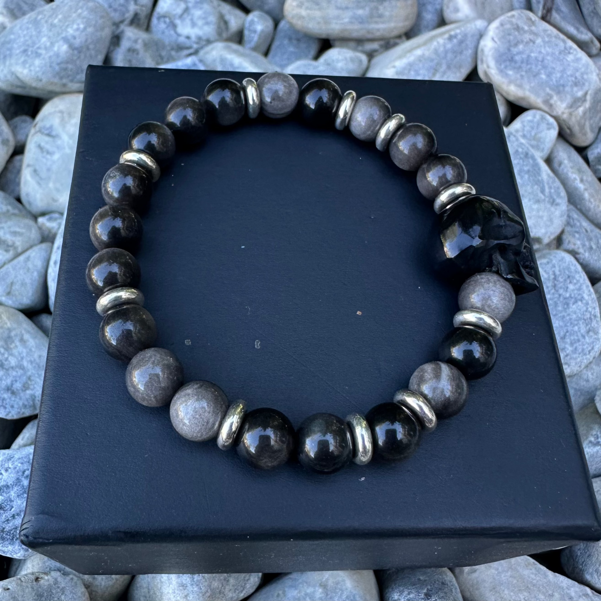 Step into the mystic allure of Lunaris, where elegance meets power. This bracelet showcases the ethereal beauty of Silver Obsidian beads, believed to shield against negativity and reveal hidden truths. The magical shimmer of obsidian brings a sophisticated touch, while ten sterling silver doughnuts add a timeless brilliance. At its heart lies a hand-carved buffalo bone skull, embodying wisdom, transformation, and the enduring strength of the spirit.