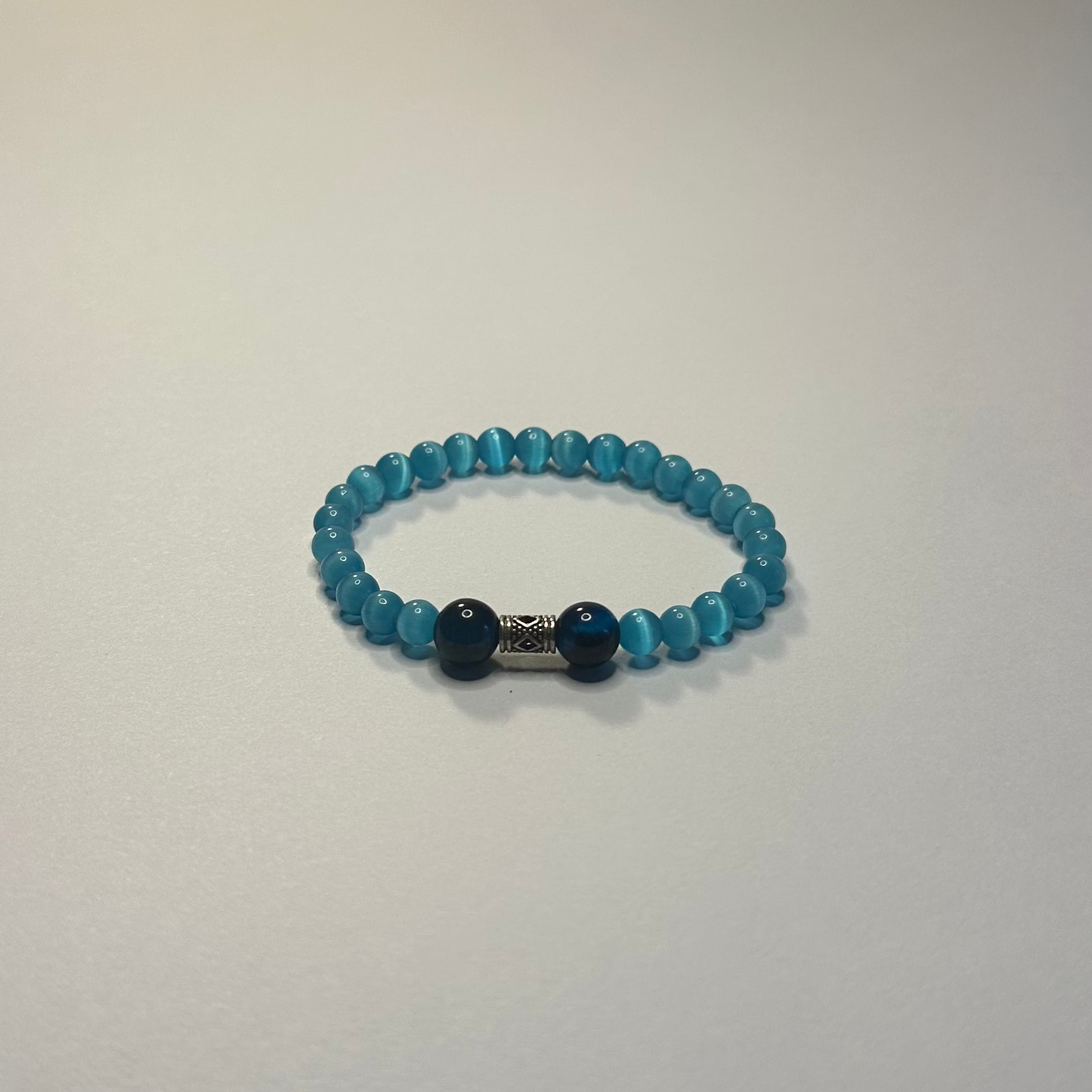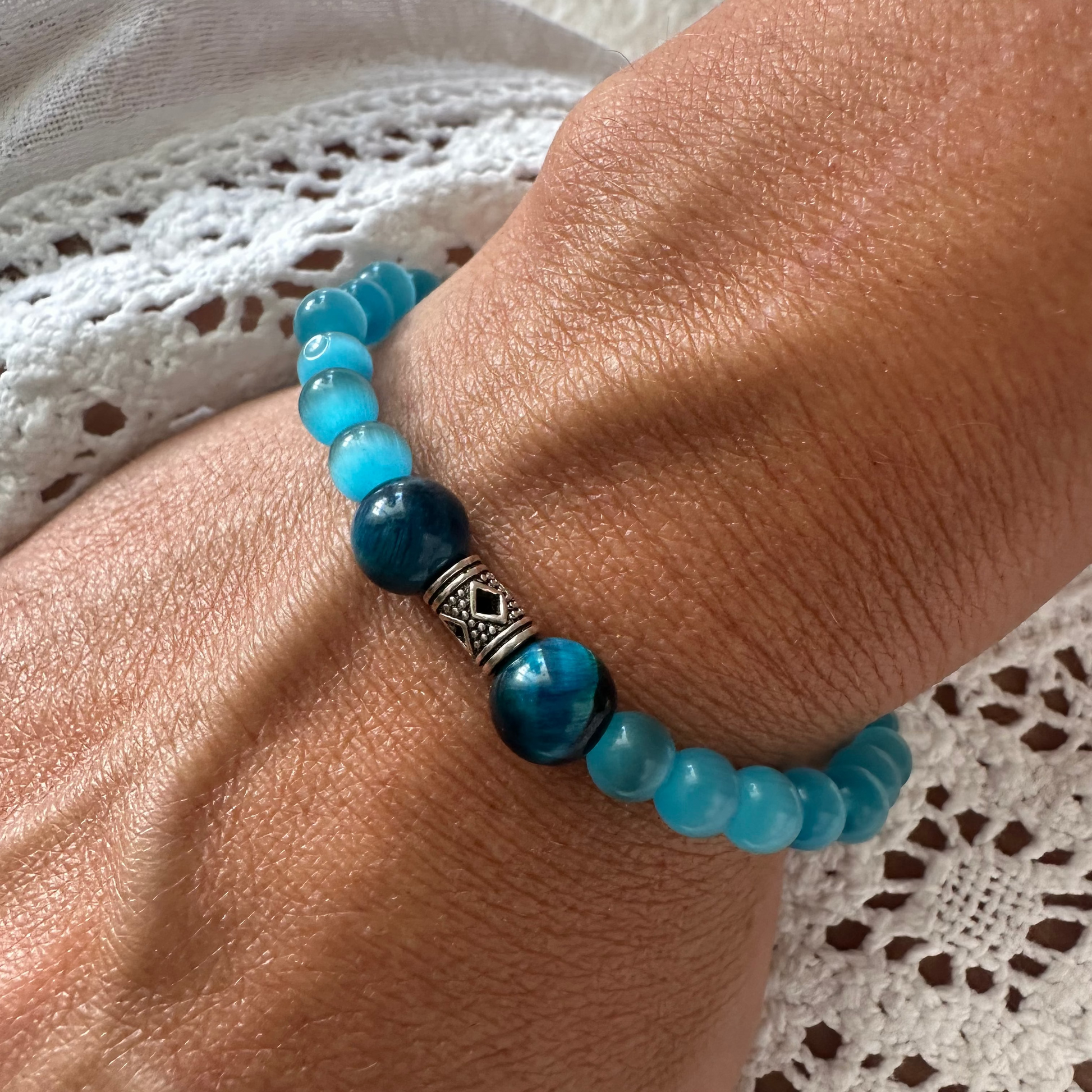 Calm meets clarity in this serene composition. Blue cat´s eye beads shimmer with intuition, while deep blue tiger´s eye beads anchor your energy. Tibetan 925 sterling silver tubes add a sacred touch to this handmade talisman.