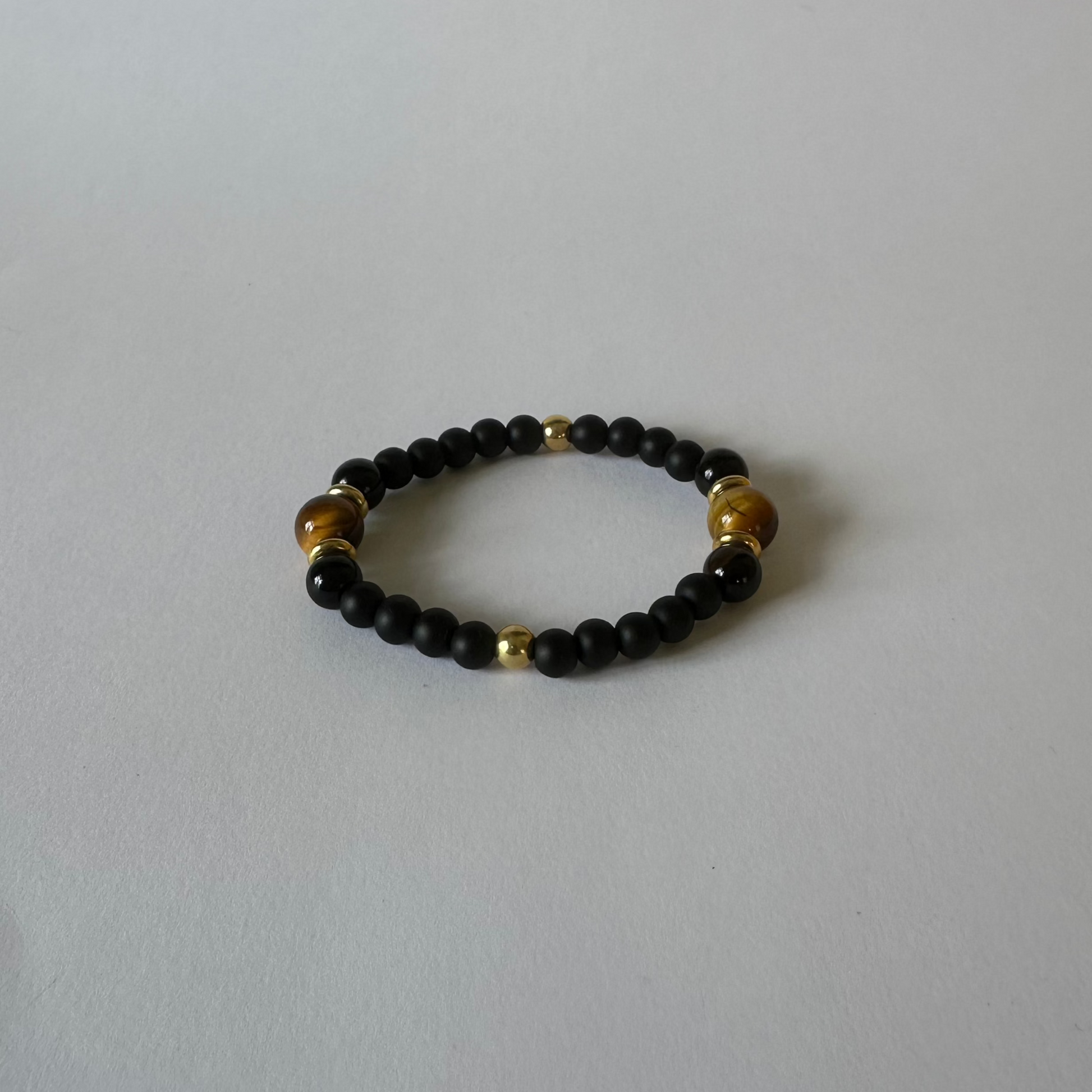 Four perfectly balanced 6mm shungite sections shape the design. Golden tiger's eye spheres and sterling silver beads with 18k gold plating offer focus and brilliance at the cardinal points.