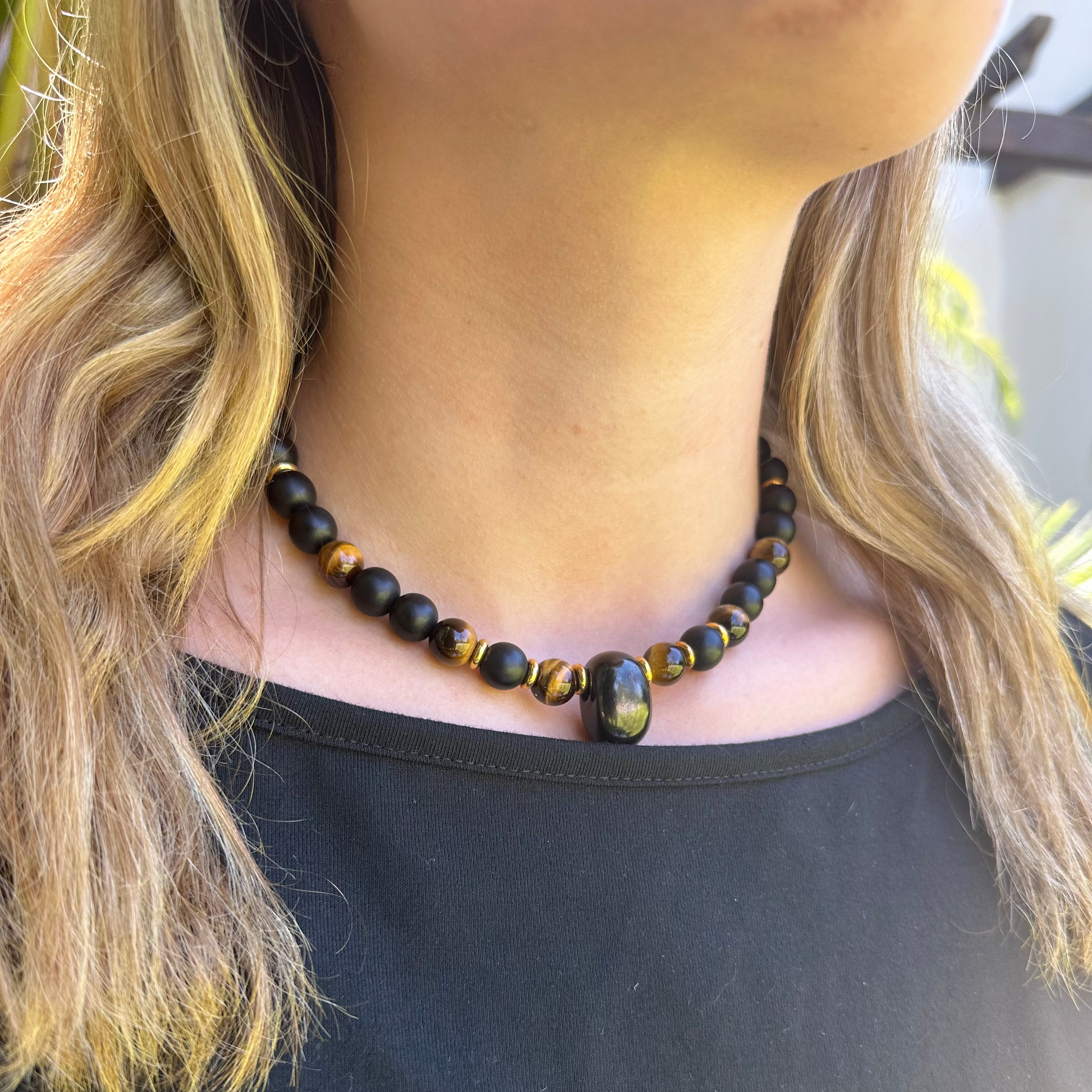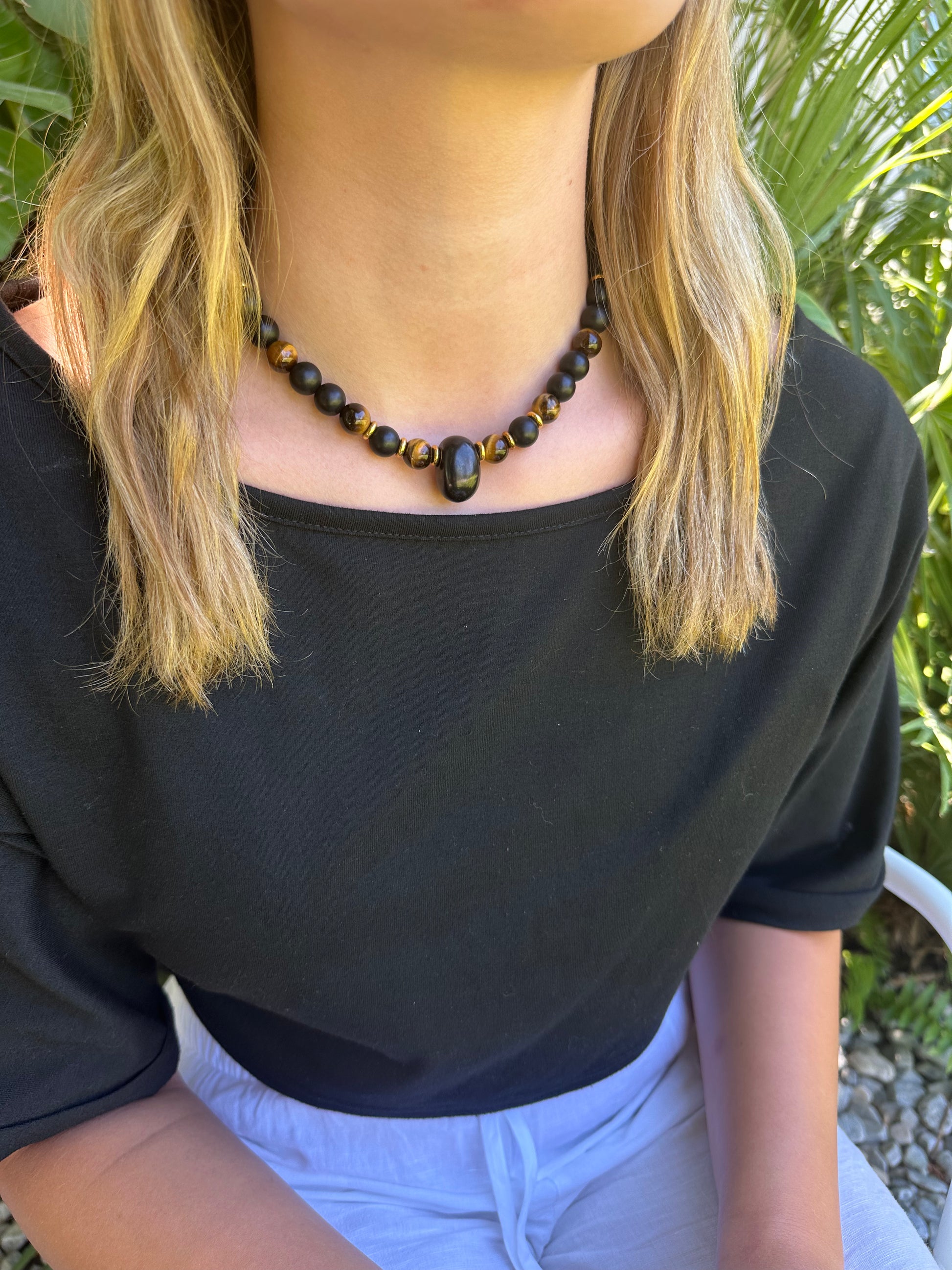At its centre, a polished 2 cm shungite stone - solid, luminous, and quietly powerful. Surrounded by 10 mm shungite beads, the piece is harmoniously woven with golden yellow Tiger's Eye stones, bringing contrast, light, and energy. Gold-plated sterling silver doughnuts add a refined gleam to the structure, elevating the composition without breaking its stillness.