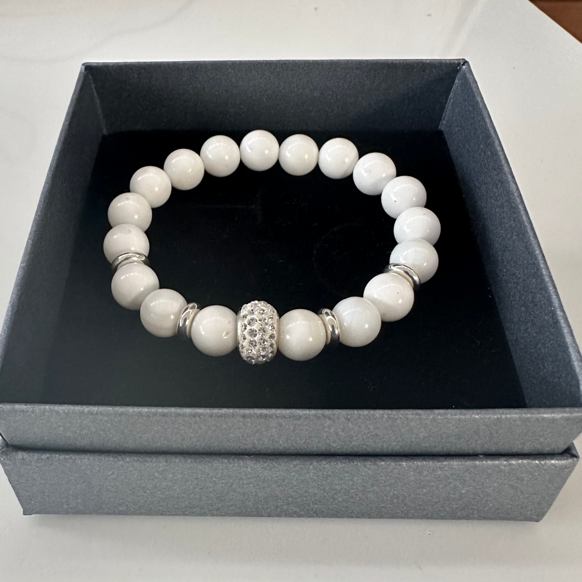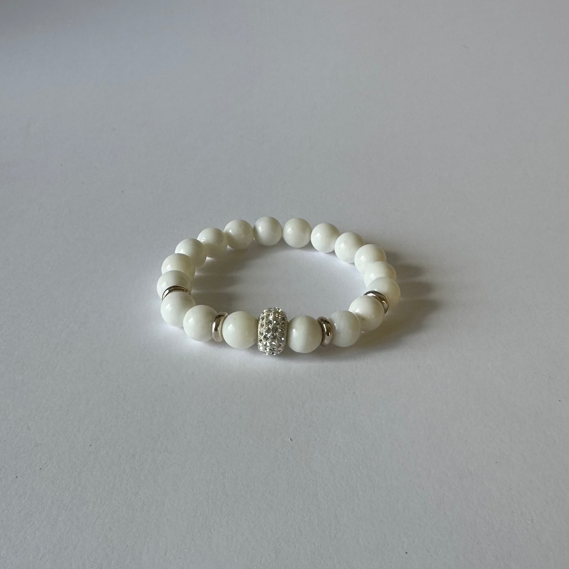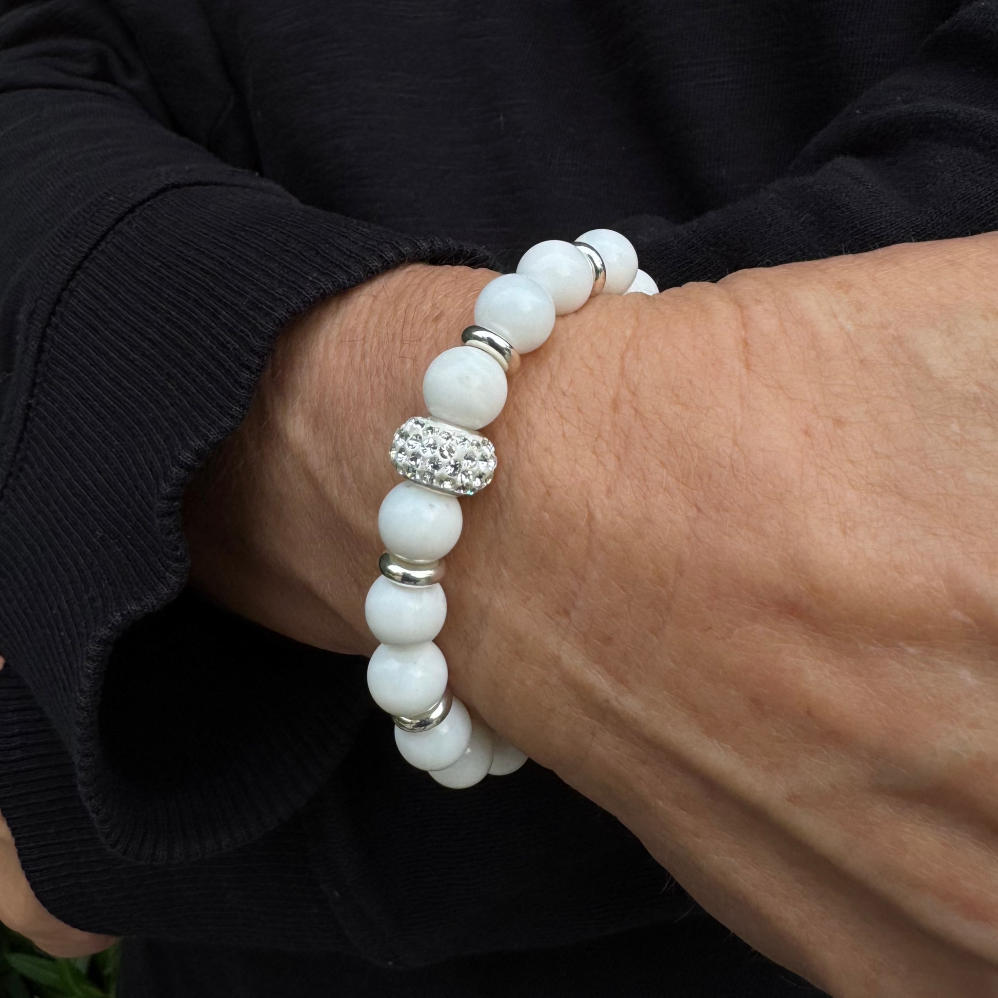 A serene design featuring jade beads, sterling silver rings, and a silver donut emblemished with brilliant white crystals.