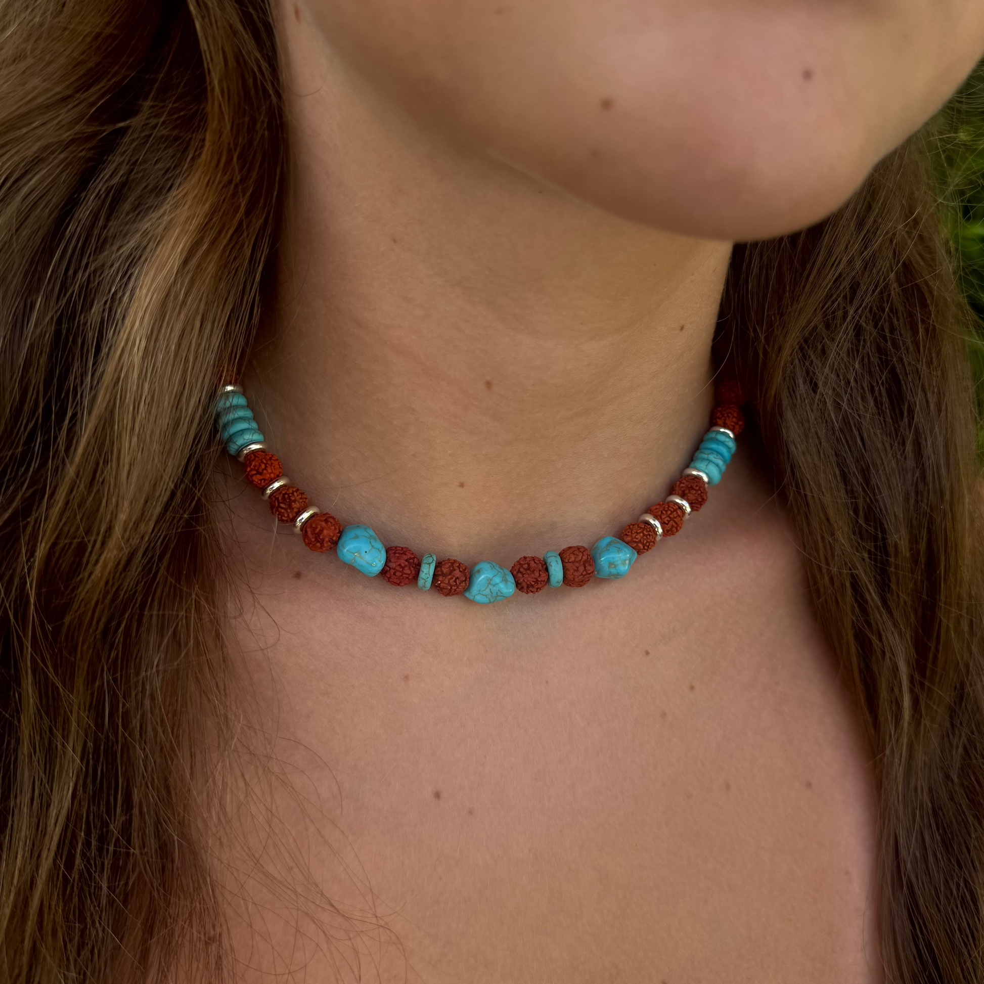 This 38 cm handcrafted jewel combines terracotta-toned rudraksha beads with turquoise discs and 925 sterling silver doughnuts, arranged in a unique pattern: three larger central turquoise stones, interspersed with rudraksha, creating balance and strength.